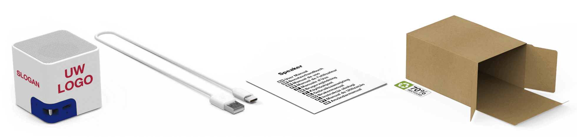 De Bluetooth®-naam is wat de gebruiker ziet op de smartphone of tablet wanneer het gekoppeld wordt aan het audioproduct. Wij kunnen deze naam aanpassen aan naar uw merknaam, waardoor uw organisatie extra bekendheid krijgt. Als u deze service niet wenst, wordt de standaardnaam 'Promo Audio' aan het product toegewezen.Accessoires