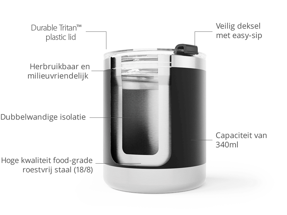 Deze beker is gemaakt van voedselveilig roestvrij staal, is duurzaam, roestbestendig en gemakkelijk schoon te maken. De dubbelwandige isolatietechnologie zorgt ervoor dat dranken tot 8 uur lang koud of warm blijven en het easy-sip deksel voorkomt morsen en lekken. Met een handige inhoud van 340 ml is deze reisbeker perfect om onderweg koffie, thee of andere dranken in te bewaren.